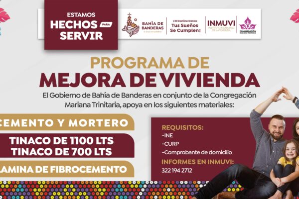 Con el firme compromiso de seguir impulsando acciones que mejoren la calidad de vida de las familias del municipio, el Gobierno de Bahía de Banderas, a través del Instituto Municipal de la Vivienda (INMUVI) y en coordinación con la Congregación Mariana Trinitaria, ha dado inicio al Programa de Mejora de Vivienda. Este programa está diseñado…