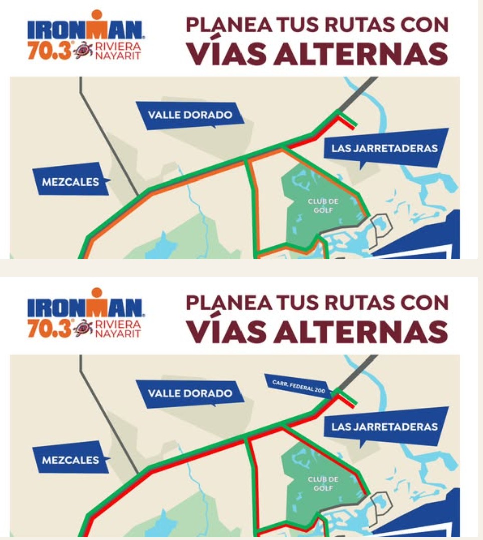 El Gobierno Municipal de Bahía de Banderas informa que este domingo 7 de diciembre se aplicarán cierres viales en Nuevo Nayarit, Flamingos, Mezcales, Valle Dorado y Jarretaderas debido a la competencia IRONMAN 70.3 Riviera Nayarit.