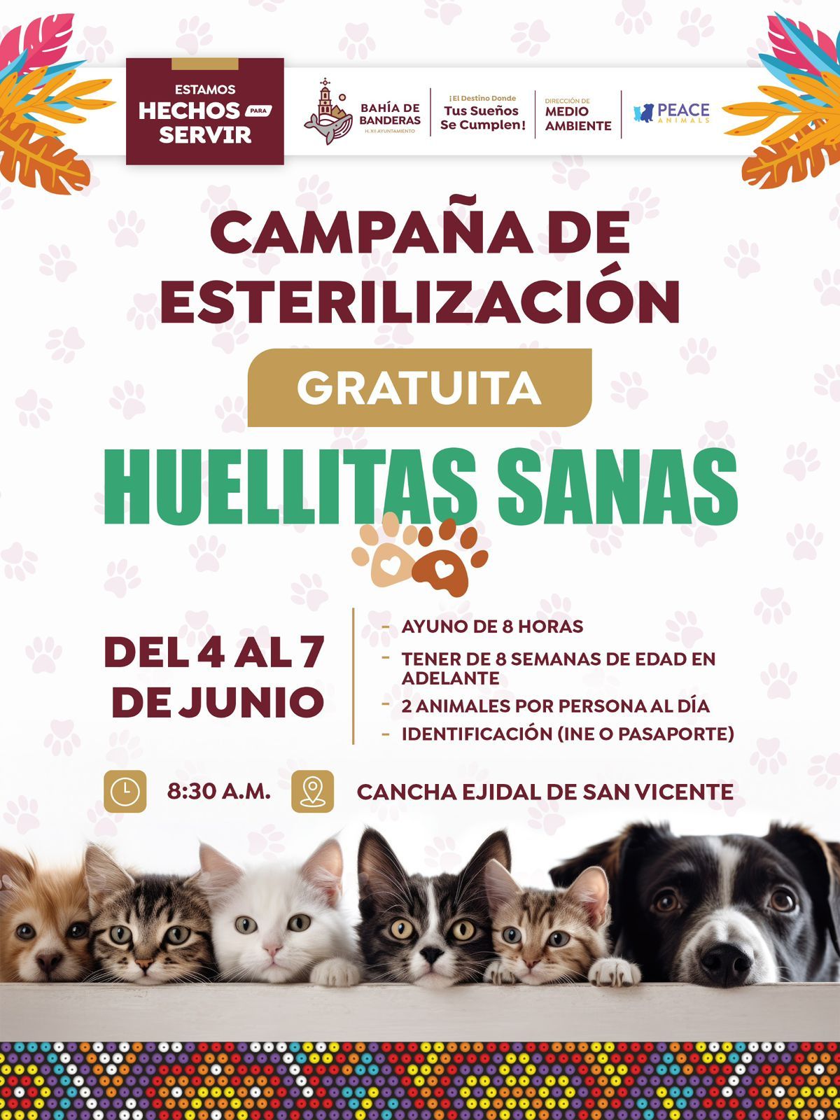 En el #GobiernodeBahíadeBanderas el cual dirige el Lic. Hector Santana a través de la Dirección De Medio Ambiente en conjunto con PEACE, estamos emocionados de anunciar nuestra Campaña de Esterilización Gratuita: Huellitas Sanas 🐶🐱. ¡Cuidemos juntos a nuestros peluditos!