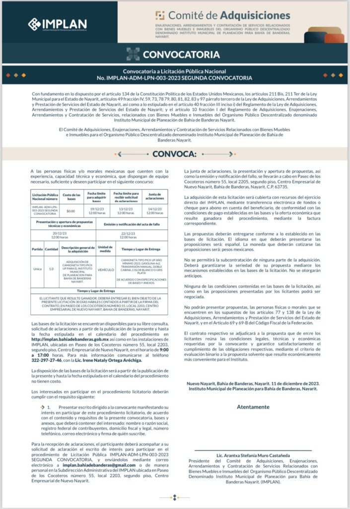 Bahía de BanderasConvocatoria a Licitación Pública Nacional perfilpoliticomx2 años atrás2 años atrás01 mins No. IMPLAN-ADM-LPN-003-2023 SEGUNDA CONVOCATORIA Navegación de entradas Anterior: Este 15 de diciembre se realizará el Festival de la Sandía 2023 en San Juan de AbajoSiguiente: Mirtha Villalvazo lleva a cabo una audiencia más en la presidencia municipal