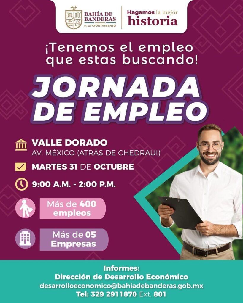 Bahía de Banderas, Nay., a 30 de octubre de 2023.- El XI Ayuntamiento de Bahía de Banderas, a través de la dirección de Desarrollo Económico, realizará una Jornada más del Empleo, en la plaza de Valle Dorado, este martes 31 de octubre, a partir de las 9:00 de la mañana y hasta las 14:00 horas, en donde se ofertarán hasta 400 empleos.