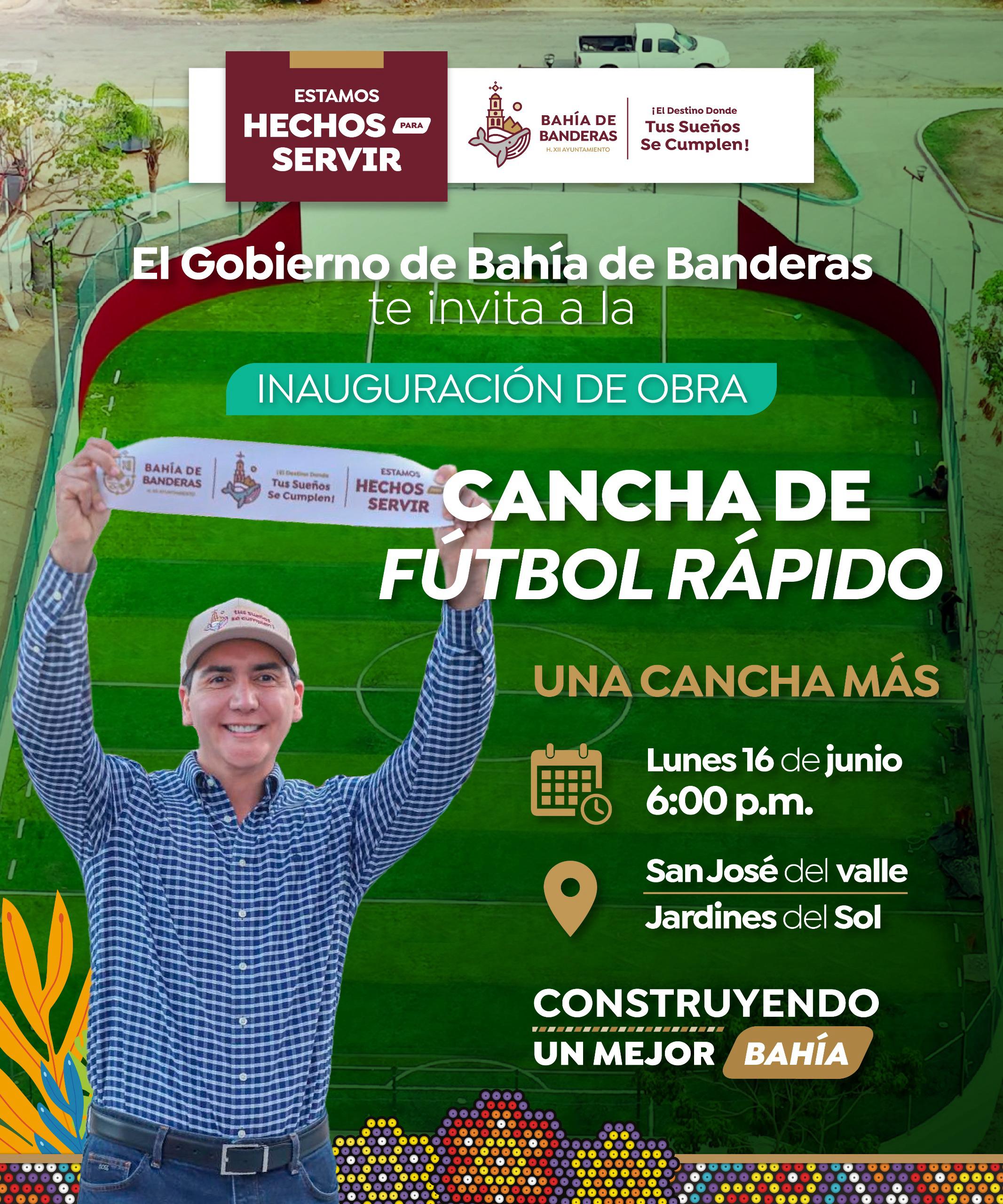 El Presidente Municipal de Bahía de Banderas @Hector Santana los invita a la gran inauguración de la cancha de futbol rápido en punto de las ⏰6:00pm y al finalizar trasladarnos al arranque de la construcción del puente peatonal para mejorar el cruce de estudiantes entre la Calle del Jazmin y Calle De Los Nardos 🙌🏻