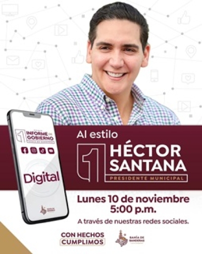 El presidente municipal de Bahía de Banderas, Héctor Javier Santana García, presentará este lunes 10 de noviembre a las 5:00 de la tarde su Primer Informe de Resultados, el cual será transmitido a través de las redes sociales oficiales del Ayuntamiento.