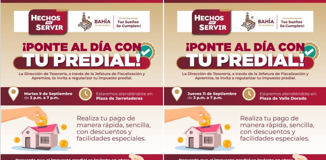 El Gobierno Municipal de Bahía de Banderas, a través de la Dirección de Tesorería y la Jefatura de Fiscalización y Apremios, invita a la ciudadanía a aprovechar las jornadas especiales de regularización del impuesto predial.