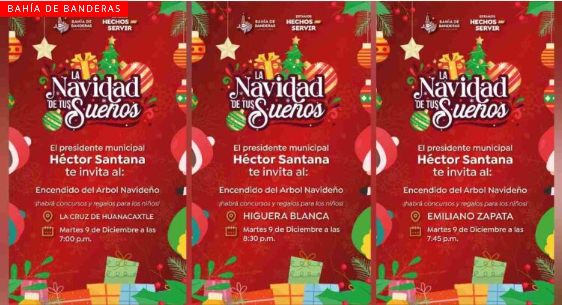 El Gobierno Municipal de Bahía de Banderas invita a la población a mantenerse al tanto de las redes sociales oficiales, para conocer las próximas fechas de encendidos navideños en las demás comunidades del municipio.
