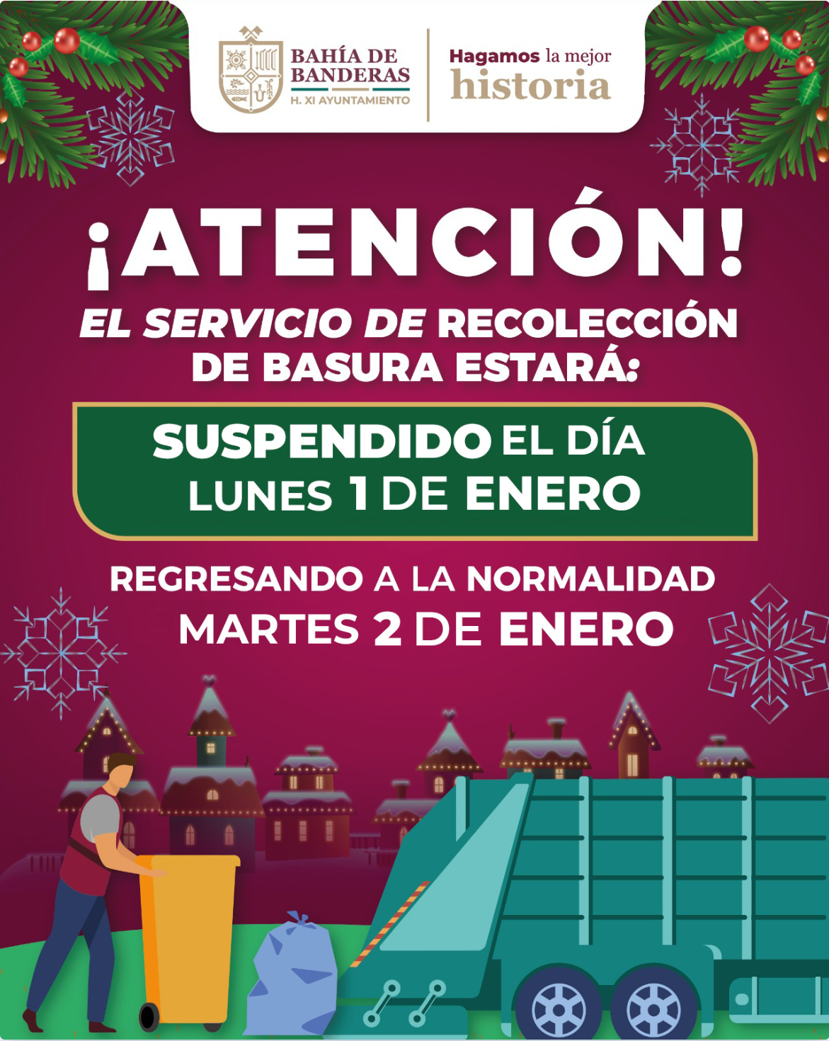 Bahía de Banderas, Nay., 30 de diciembre de 2023.- Dada las celebraciones por el Año Nuevo, el 31 de diciembre y el 1 de enero, las labores de recolección de basura, pertenecientes a la Jefatura de Aseo Público, se verá suspendida, por lo que el gobierno de Bahía de Banderas solicita a la población no sacar su basura en los días antes mencionados.