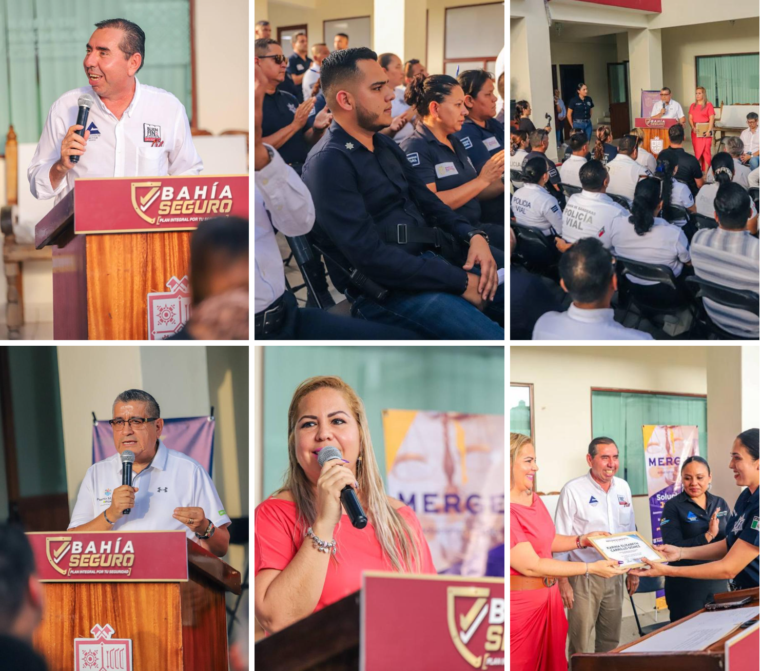 Bahía de Banderas, Nay., a 7 de noviembre de 2023.- Derivado de la estrecha coordinación que existe entre el gobierno de Bahía de Banderas con el sector empresarial, específicamente con la Cámara de Comercio (CANACO) y la Cámara Nacional de Comercio, Servicios y Turismo en pequeño (CANACOPE SERyTUR) de Bahía de Banderas, Puerto Vallarta y Compostela; esta tarde la presidente Mirtha Villalvazo Amaya, junto con los representantes de las cámaras y empresarios, entregaron un premio en reconocimiento a la labor que con honor han desempeñado los elementos de la dirección de Seguridad Ciudadana y Tránsito de la XI Administración.